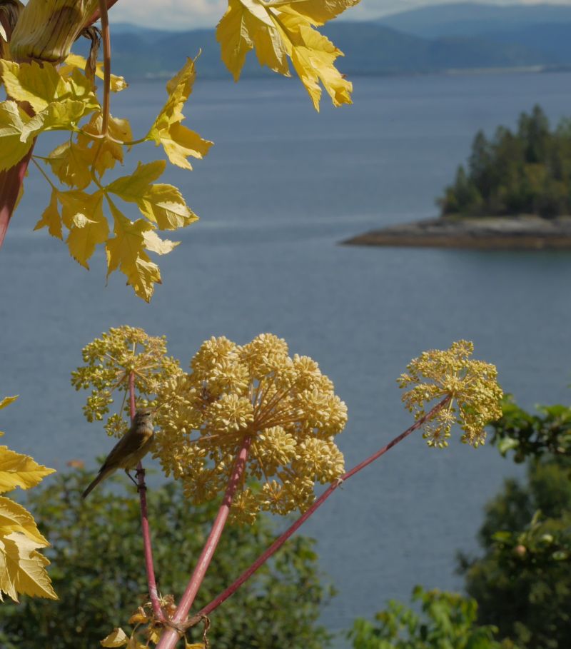 P1760486 August 3, 2017 800 × 909 Edimentals in the garden; early August 2017 Who are you sitting in my Angelica atropurpurea? Fieldfare / gråtrost? Optimized print or PDF