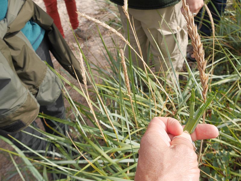P1780172 September 3, 2017 800 × 600 Allinge talk and walk Thomas taught us how sand ryegrass (Leymus arenarius) leaves are used as a flavouring. Bending and crushing leaves releases the aroma from the leaves! Optimized print or PDF