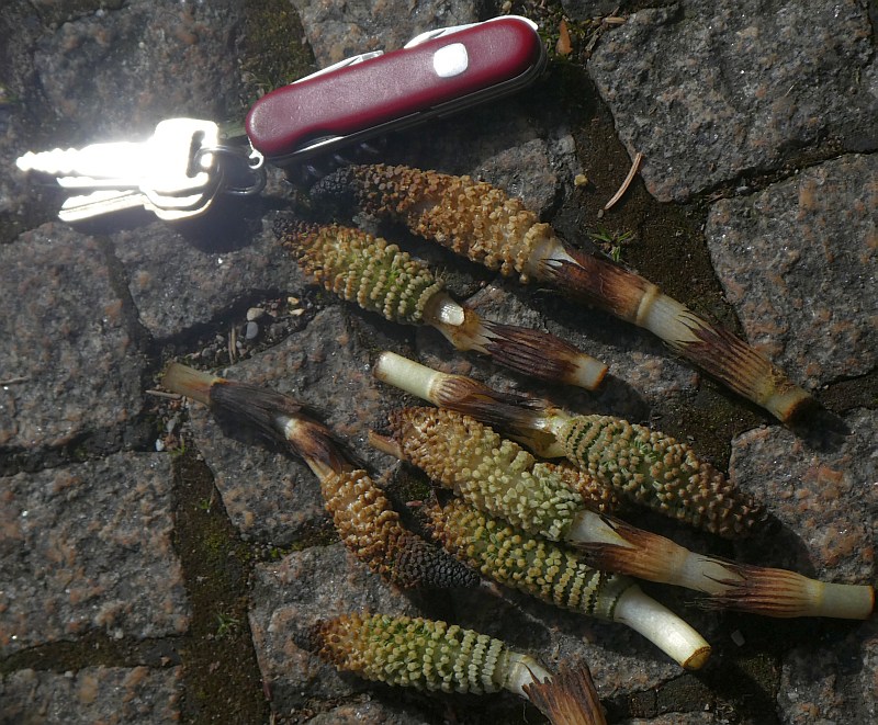 These were collected to eat at the symposium. However, it wasn’t Equisetum arvense (too large) and knowing there are poisonous species in the genus, I persuaded them not to use them and they were thrown out. I now know it was E. telmateia which I know was used by native americans in Western North America