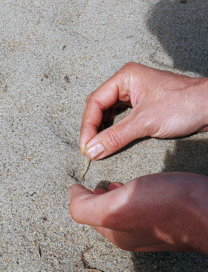 P1820719 April 30, 2018 800 × 1043 Day 2 of the Hvaler Permaveggies Course Randy shows us a speciality of the park, Strandmaurløve / ant-lion (Myrmeleon bore), a threatened species in Norway See https://www.artsdatabanken.no/Pages/223124 Optimized print or PDF