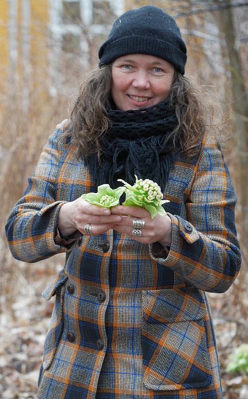 P1820804 May 4, 2018 500 × 804 Around the World with Fuki Ingunn Moslet showing off the Petasites japonicus, Fuki she had found Optimized print or PDF