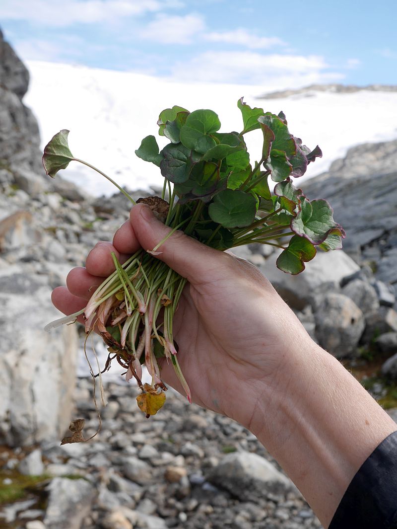 P1850039 July 21, 2018 800 × 1065 The Nordic Permaculture Festival 2018 in Jondal Oxyria digyna (mountain sorrel /fjellsyre) with the glacier Optimized print or PDF