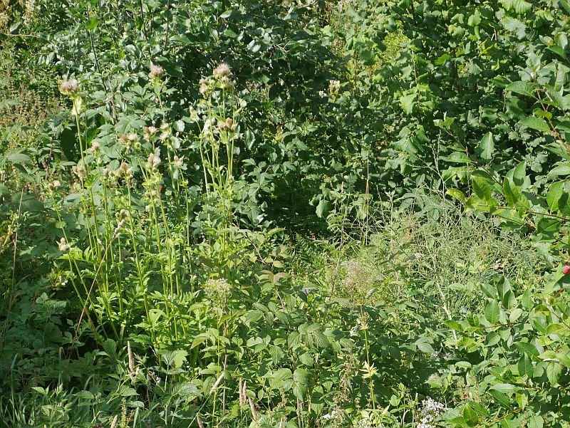 P1850067 July 21, 2018 800 × 601 Perennialen IV The forest garden with Cirsium oleraceum (cabbage thistle / kåltistel) Optimized print or PDF