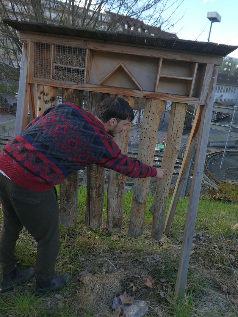 P1100808 August 28, 2018 800 × 1067 Talking in a swimming pool: Neubad and Neugarten Sven showing me the bee hotel Optimized print or PDF