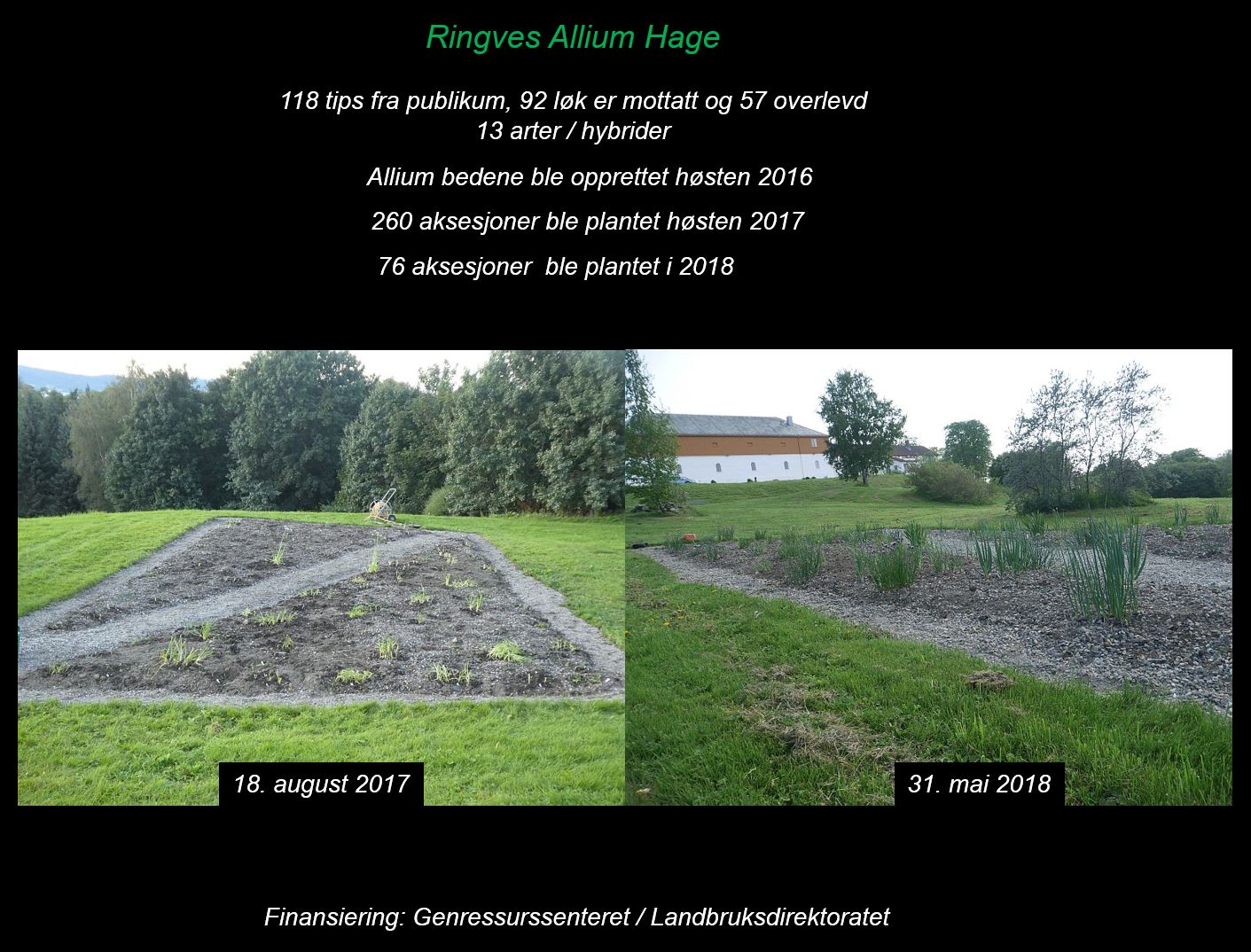 Concerning the Norwegian onions, we received 118 tips from the public, 92 were received and 57 of these have been planted (13 species and hybrids). About 90-100 species can be seen here. The garden was cultivated during Autumn 2016, 260 accessions were planted in 2017 and a further 76 in 2018!