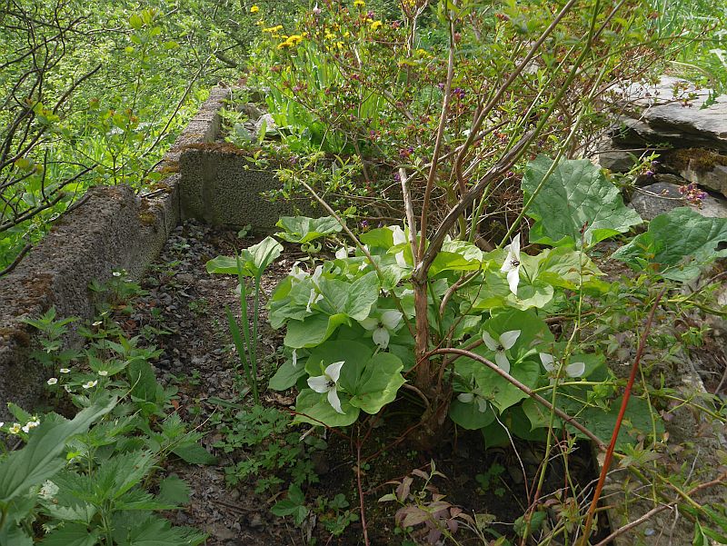 P1950705 June 2, 2020 800 × 601 Trillium days in the edible garden Trillium cernuum is growing on an acid bed under blueberries together with a large expanding patch of Trillium erectum “Album” Optimized print or PDF