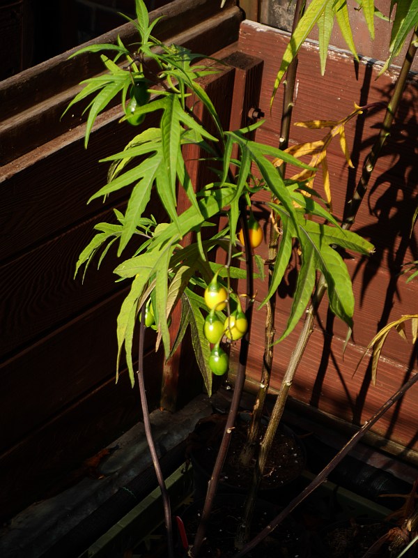 P1670763 November 4, 2016 600 × 800 Unusual edibles at Chelsea Physic Garden Solanum aviculare, Kangaroo Apple has edible fruits eaten fresh and dried when completely ripe. I saw poroporo growing wild in New Zealand years ago.. Optimized print or PDF