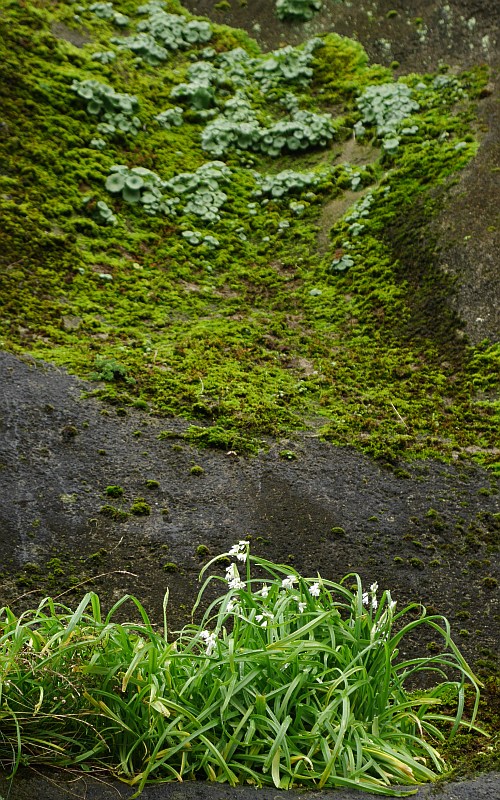 P1520272 January 9, 2017 500 × 800 Wild edibles in SW England in late February Allium triquetrum (in flower) with navelwort on vertical cliff, Mewagissey, Cornwall Optimized print or PDF
