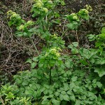 In late February last year I was in Cornwall for a short visit and had a head start on the year’s wild edible foraging with two less hardy species in particular that I’ve struggled to grow in the past….Alexanders (Smyrnium olusatrum), suspected to be one of the plants brought north by the Romans for food and common particularly on coastal areas in the UK, and Navelwort (Umbilicis rupestris), another plant at the north of its range in the UK. I was surprised to find Alexanders almost in flower, perfect for delicious stir-fried wild greens with Alexanders broccoli and navelwort greens served over soba (buckwheat pasta)!