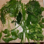 Some of the plants we collected were: Gunnera manicata, Saxifraga stolonifera, Hemerocallis spp. (daylilies), Hosta (leaves and flowers), Allium wallichii (two forms), Ligularia fischeri, Allium nutans, Allium schoenoprasum sibiricum, Ostrich Fern, Lilium leichtlinii, Lime leaves, Cacalia (Parasenecio) delphiniifolia, Hops, Aralia cordata (Udo), Aralia elata, Angelica gigas and Aster macrophylla. Flowers of Yucca filamentosa were used in the salad!