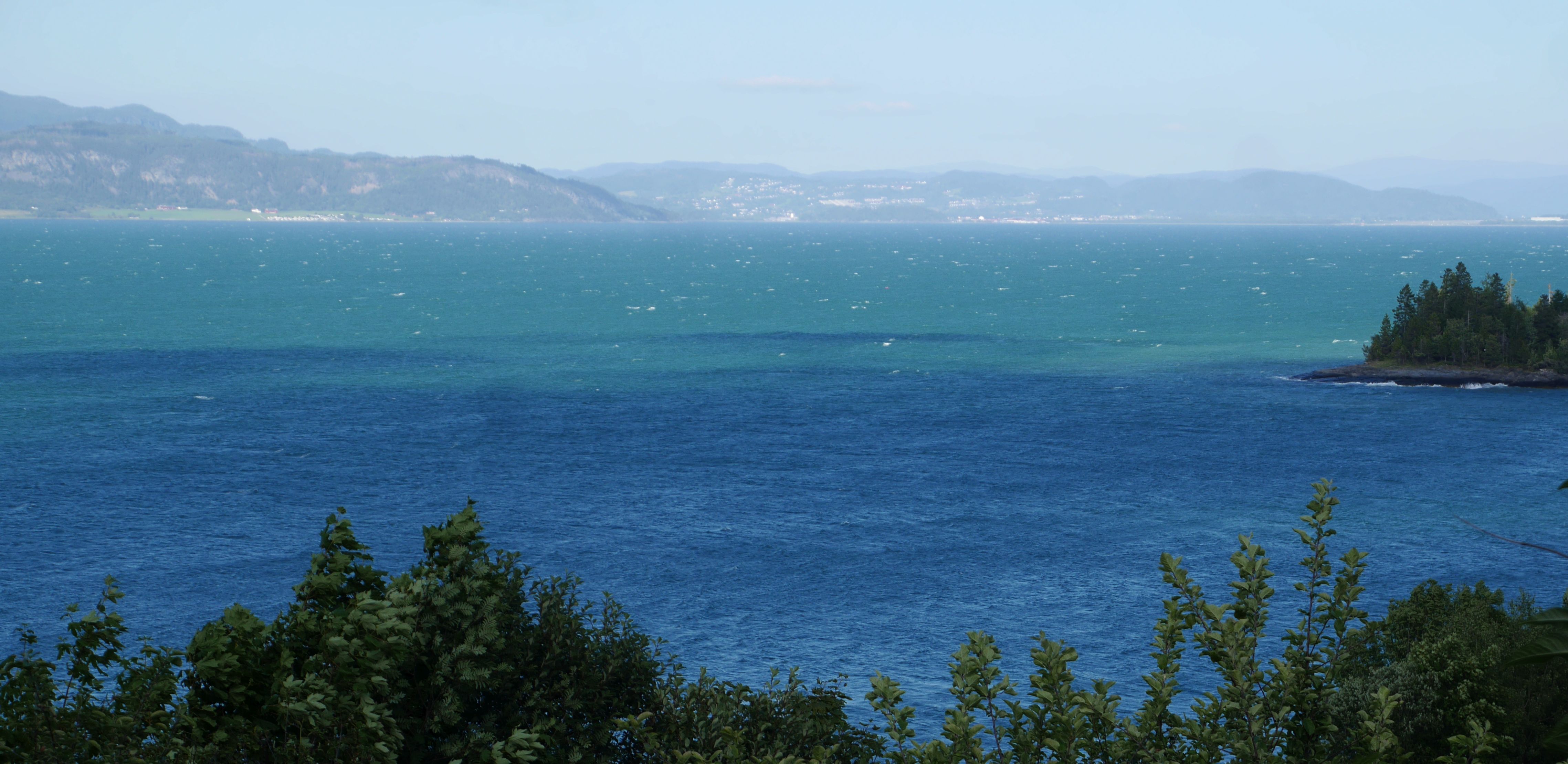 The fjord was looking greeny blue all day in the sun, perhaps coloured by an algal bloom, then the wind picked up and a front moved across the fjord with cloud giving this amazing view of a two coloured fjord…closest to us in shade! The temperature plummeted from around 23C to 13C in short time.