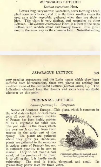 Celtuce probably arrived in Europe around 1900 and is mentioned in Vilmorin’s The Vegetable Garden from 1920 (picture) alongside perennial relative Lactuca perennis which I’m also trialling this year.