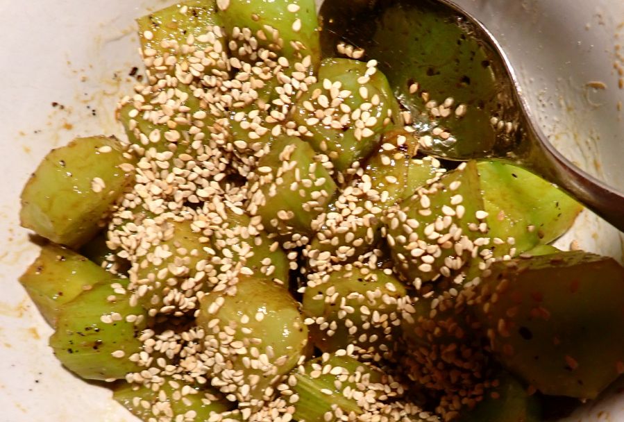 Over the last couple of years I’ve been trialling celtuce in the community garden (also known as stem or asparagus lettuce / stilksalat). I’ve decided that this is a vegetable well worth growing for preparation as a salad or in various cooked dishes. This is a vegetable developed from the same species as lettuces (Lactuca sativa, var. angustana) but bred for the thickened flowering stem rather than the leaves and harvested up to flowers appearing. Peeling away the outer layer the “flesh” is free from coarse fibers with a crispy texture when eaten raw and is also mild tasting. The cluster of leaves at the top of the stem can also be used if harvested early enough. During a visit from Rick Akerboom of Elleville Planter (see https://www.ellevillevekster.no), who gave me seed of one of the 4 varieties I grew this summer, he prepared a simple but delicious salad from the diced stem with a dressing of olive oil, soy sauce and roasted sesame seeds (the same way we prepare perennial udo (Aralia cordata) shoots in spring and similar in texture too!