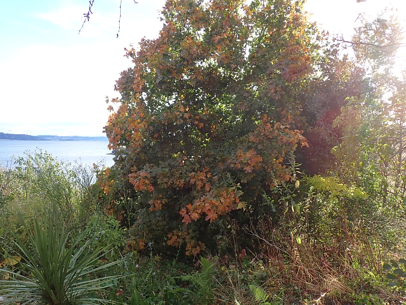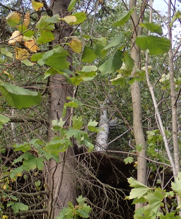 Amy hit us with full force yesterday afternoon and left a lot of damage in its wake. It could have been worse, but my garden wasn’t spared, with a massive “rotvelt” (root throw) partly downing one of the tallest trees in the garden, a Norway maple (spisslønn), the second large tree to fall this year (see also: