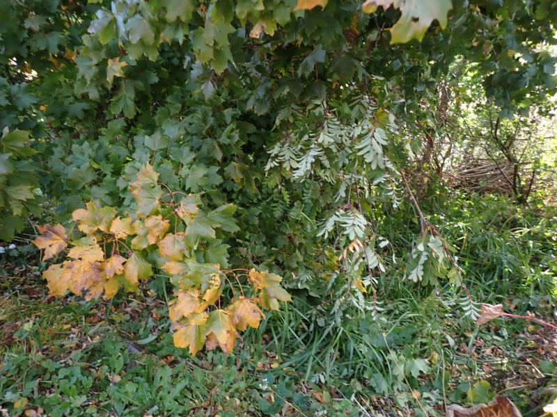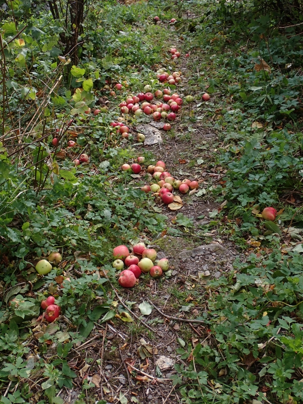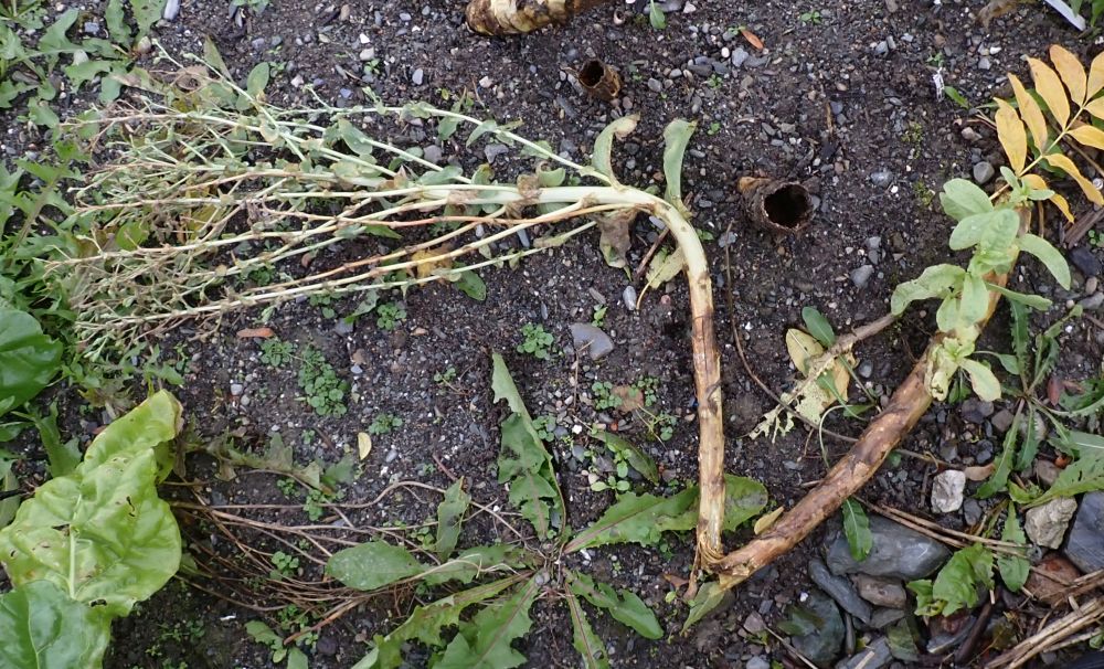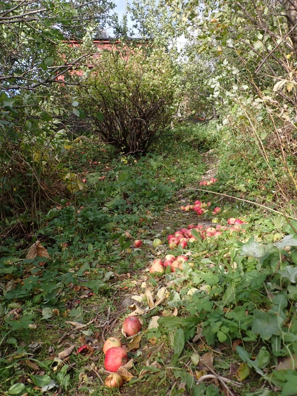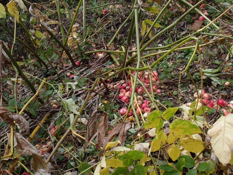 Apple harvest will be easier although the fruit will maybe won’t store so well. The third photo shows apples lying under my udo (Aralia cordata) which was also toppled.