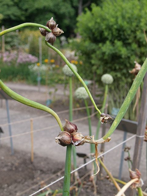 -Luftløk or etasjeløk (Egyptian onion) is another hybrid with Allium cepa, this time with Allium fistulosum which forms large topset onions instead of seeds. The stems collapse in autumn falling down and planting the topsets at some distance from the mother plant, hence walking onions in North America. Etasjeløk is the variety forming several levels of topsets as they sprout and form new topsets. This is the Catawissa onion of North America, deliberately crossed at the Catawissa research station in the 1870s and, due to its curious form and ease of multiplication is now found worldwide.
