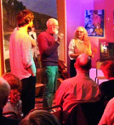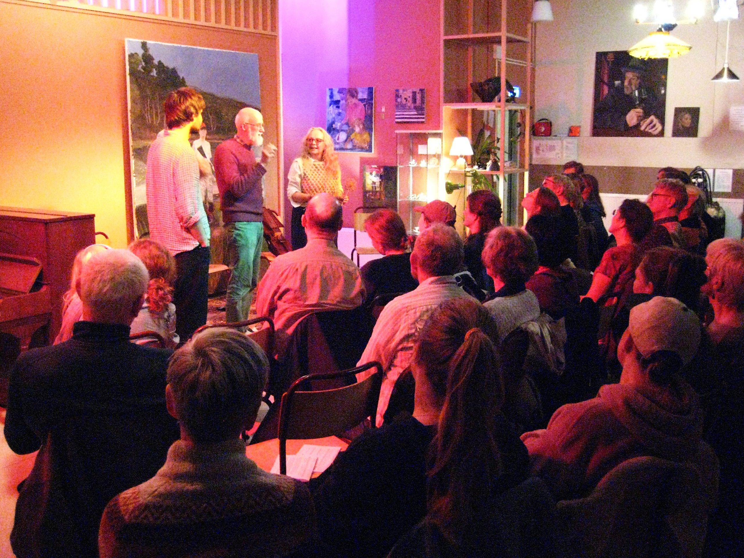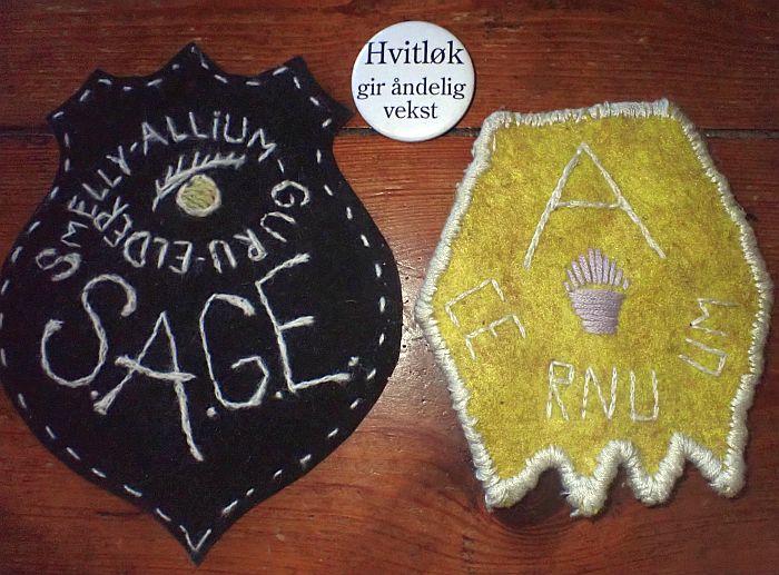I enjoyed myself last Tuesday evening talking about onions with Marianne Meløy and Amund Storløkken Åse, surrounded by some amazing art at Atelier Ilsvika, in an eclectic acoustic mix of traditional Norwegian folk music (Guro Kvifte Nesheim kvintett), jazz, ethnobotany, Alliums, humour, Peer Gynt’s philosophical onion and vampires! And they even performed a crazy traditional Swedish folk song “Røkt gjøk med løk” (smoked cuckoo with onions)! See https://www.youtube.com/watch?v=P92JsFOLjtY and https://www.itromso.no/feedback/i/Bjqezl/dette-er-tidenes-10-psykeste-later I wore my “Hvitløk gir åndelig vekst” badge (pictured below with two other wonderful onion badges created by my artist daughter Hazel that I didn’t have time to present!)