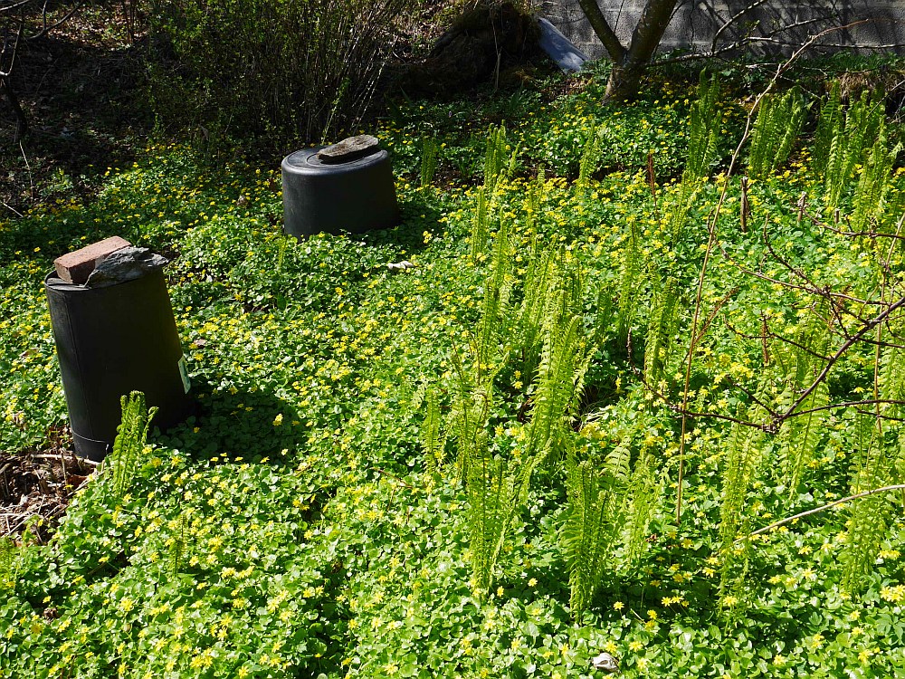 The local variety of ostrich fern has already come too far to eat, here in a sea of lesser celandine flowers with buckets over my udo plants!
