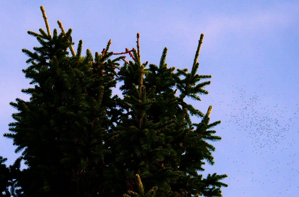 A swarm of flies to the right of the top of this spruce in the garden!
