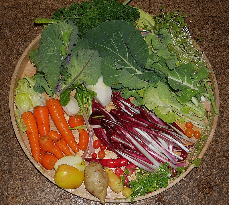 Carrots, chicories, beetroot, tomato, apples, False watercress (Apium nodiflorum), Physalis, sweet potato shoots, wild buckwheat shoots, various kales, ocas, turnip, parsley….