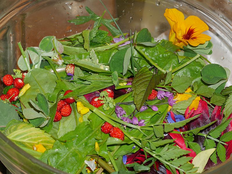 …..and adding a few other things to the one species udo and American spikenard salads (Aralia cordata and Aralia racemosa) and this was the result, the summer’s first extreme salad, on the anniversary of the filming of the extreme salad youtube videos (“B” in the following link!) http://www.edimentals.com/blog/?p=16712