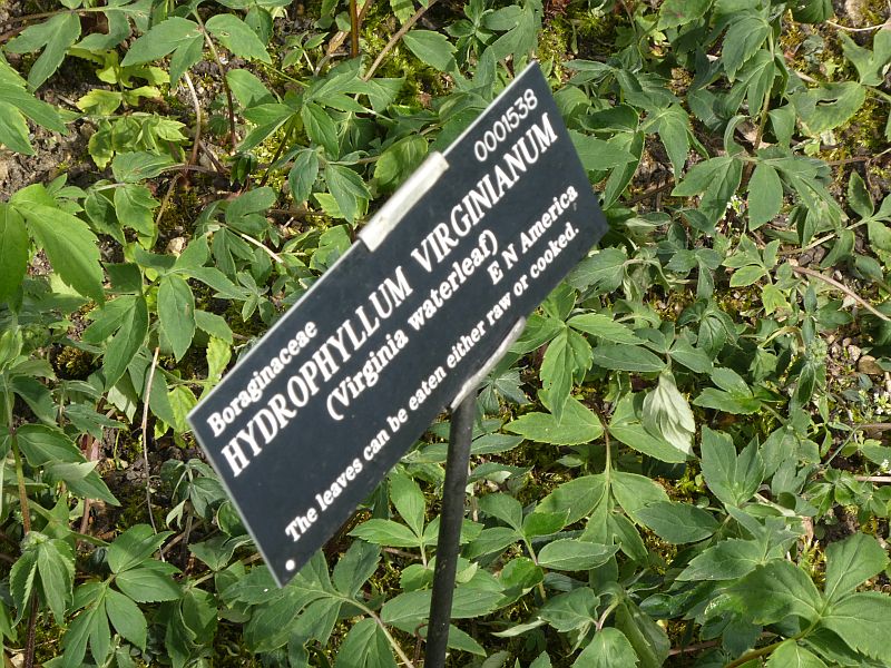 P1030431 May 10, 2017 800 × 600 Edimental spotting in the Oxford Botanical Garden Not many of the plant signs say anything about edibility, so I was surprised that this waterleaf mentions this (also in my book) Optimized print or PDF
