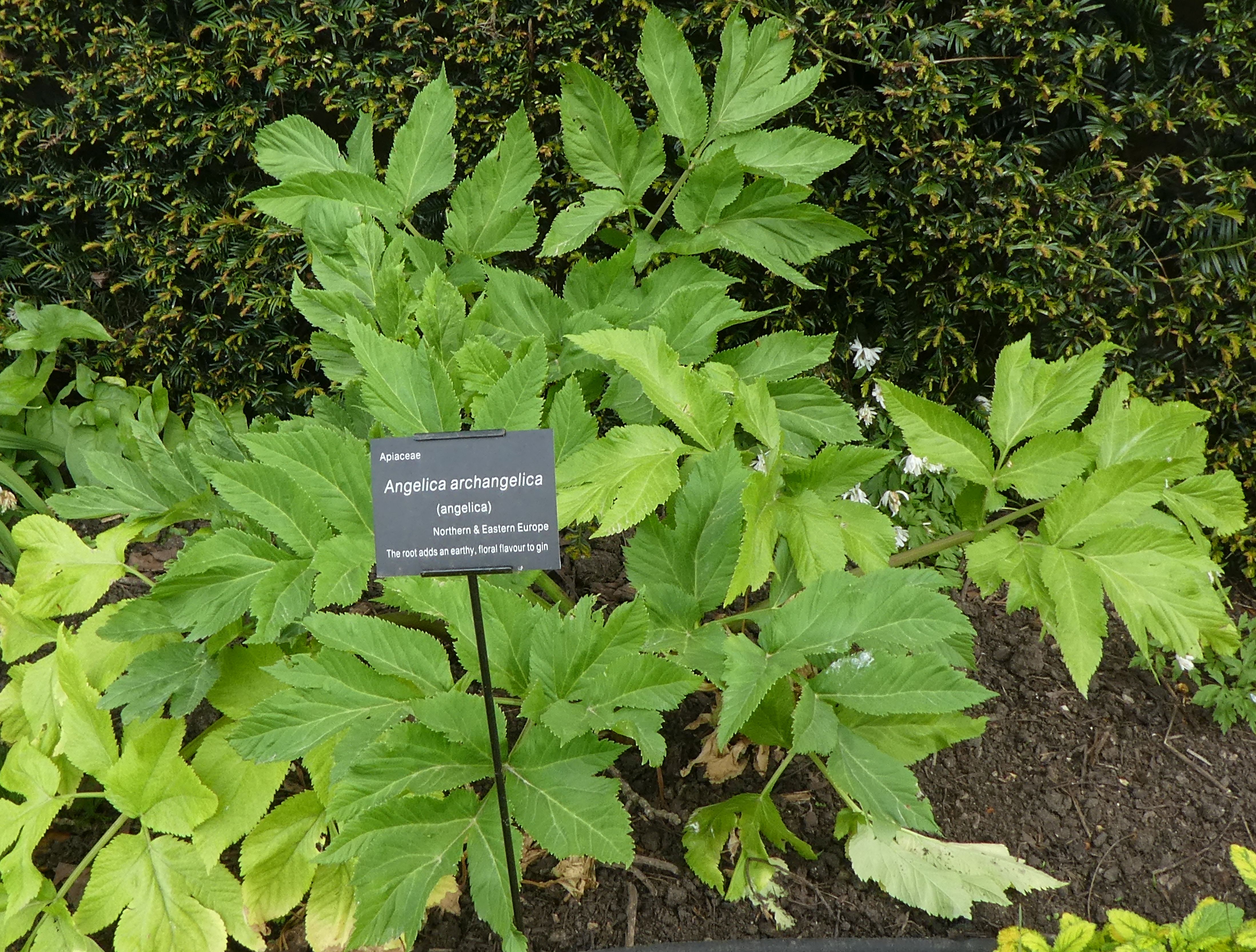 P1030553 May 10, 2017 4394 × 3331 Edimental spotting in the Oxford Botanical Garden Archangelia angelica (the sign says that the root adds an earthy, floral flavour to gin) Optimized print or PDF