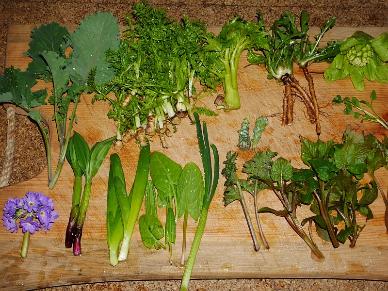 I’d decided to make perennial veg pakora again (see http://www.edimentals.com/blog/?p=17273). From top left and clockwise are seen: Perennial kale, Caraway, Voss Angelica (Vossakvann), Dandelion, Fuki, Rhodiola, Barbarea vulgaris, Hydrophyllum, Hablitzia, Heracleum (hogweed shoots), Allium hymenorrhizum, Rumex acetosa, Allium nutans, Allium victorialis and Primula denticulata
