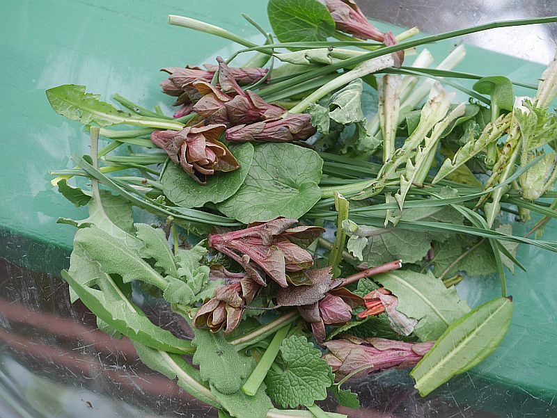P1880717 February 17, 2019 800 × 601 The first garden forage of the year! Lunch today: Hablitzia, Lesser celandine (vårkål), Rumex spp., Hedge garlic (løkurt), Arabis alpina, dandelion (løvetann), Allium cernuum, Allium carinatum Optimized print or PDF