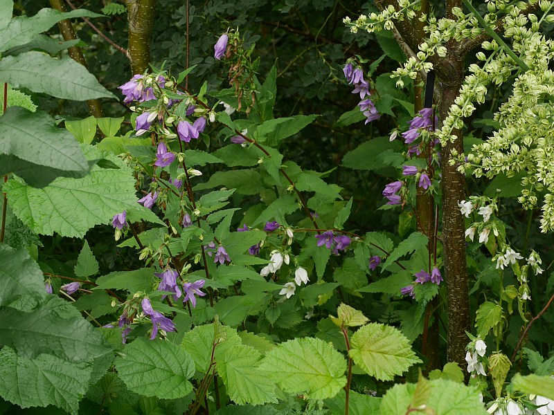 P1620745 August 3, 2016 800 × 600 Weekend garden pictures White and mauve coloured flowers of edible Campanula trachelium (nettle-leaved bellflower / nesleklokke) with poisonous Veratrum californicum on the right in full flower. Optimized print or PDF