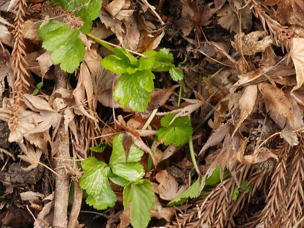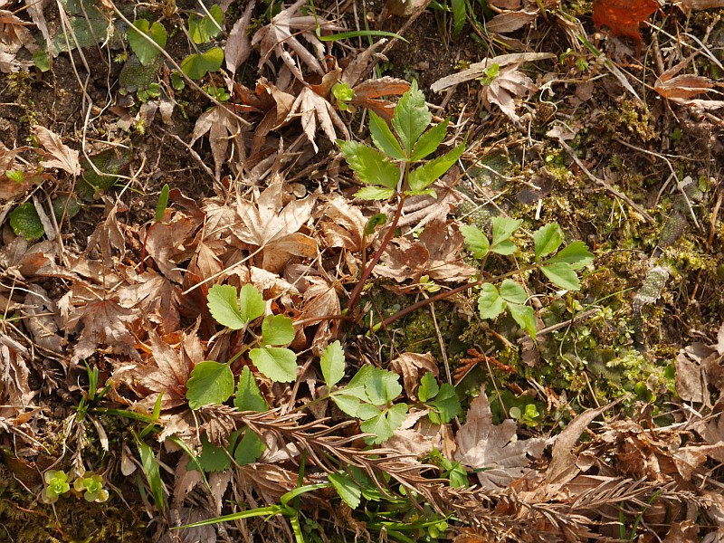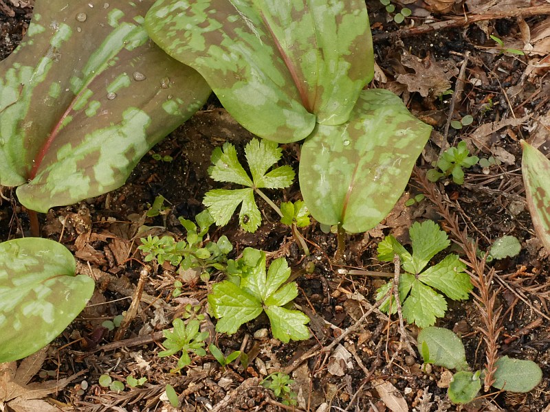 Young Cacalia delphinifolia (shidoke) with the larger leaves of Erythronium japonicum. I later found this species for sale in a supermarket, see http://www.edimentals.com/blog/?p=6340