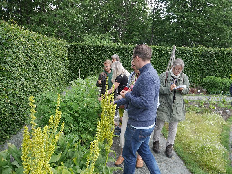 Sampling Myrrhis odorata (sweet cicely) flowers and young seeds for the salad in the Renaissance Garden…more about the Renaissance Garden which has 123 plants that were documented grown in Trondheim in the 1690s in the following link including a salad I made on the opening of the garden some years ago! Poisonous Veratrum (False Hellebore / Nyserot) in the foreground was discussed as a confusion species to edible Hostas!