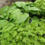 Boehmeria tricuspis (related to nettles) has edible shoots, growing here in a woodland garden with Hosta