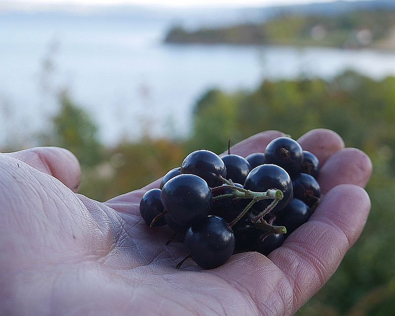 My first ripe North American golden currants or buffalo currants (gullrips), Ribes aureum, were awaiting my return from the US today. This is probably the black-fruited cultivar “Black Pearl”. It has beautiful aromatic large yellow flowers, so qualifying also as an edimental! The taste is closest I think to Worcesterberries and blackcurrants.