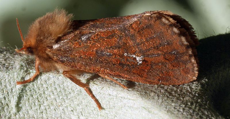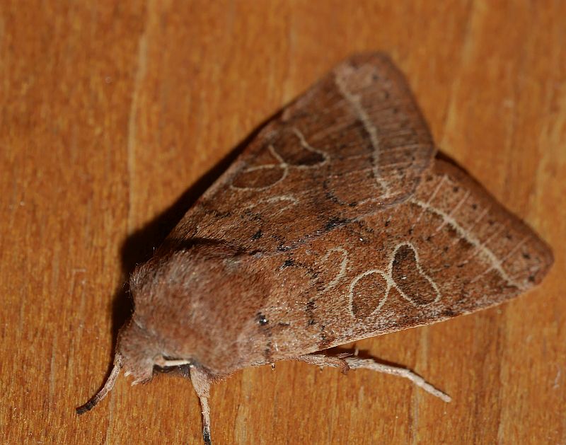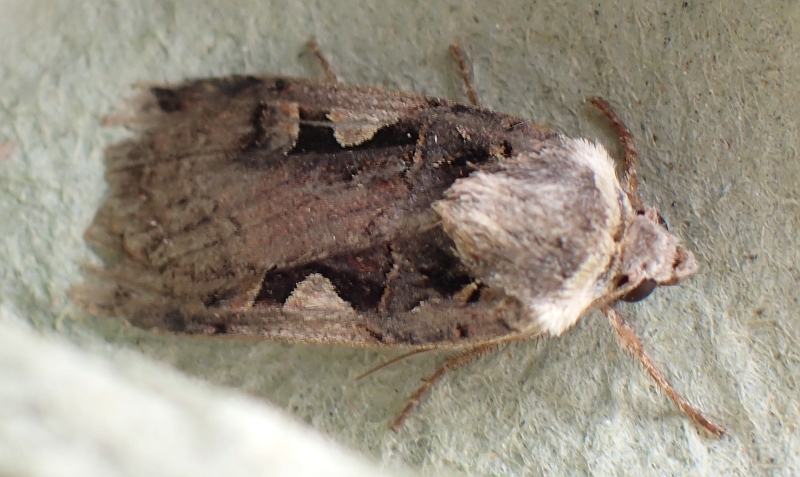 33. Purple clay / Rødfrynset teglfly (Diarsia brunnea); 1st to 14th July. Overwinters as a small larva. Larval food plants: Herbaceous plants in autumn including foxglove and figworts (Scrophularia spp.) (both in the garden). In spring also on woody plants like bilberry, heather, Salix spp., bramble and birches (the last 3 in the garden). NEW SPECIES FOR MALVIK MUNICIPALITY*