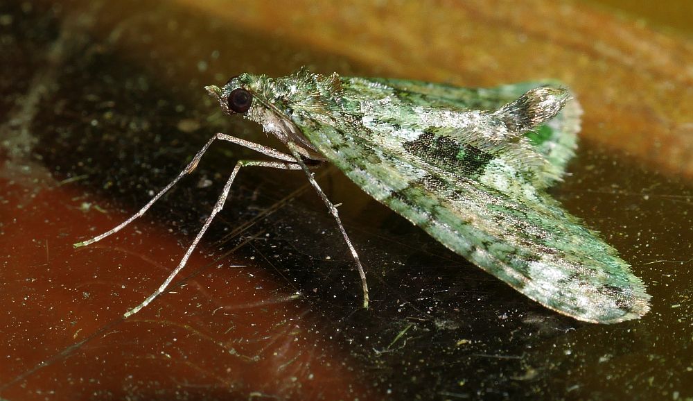 32. Garden pebble / Kålmott (Evergestis forficalis); 30th June to 15th July. Larval food plants: Various Brassicaceae including cabbages, horseradish, radishes and swede (all in the garden). NEW SPECIES FOR MALVIK MUNICIPALITY* in 2019 (Second record for Trøndelag county and furthest north record in Norway)
