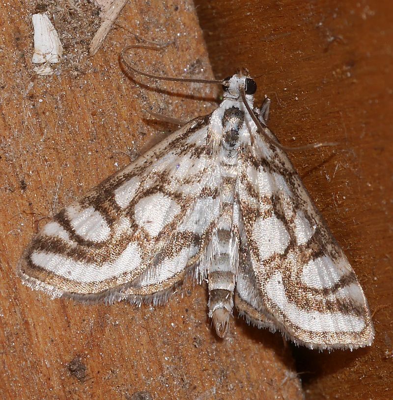 22. Small Magpie / Nesleengmott (Anania hortulata); 24th June to 18th July. Larval food plants: Nettles and occasionally other members of the Lamiaceae such as white horehound (Marrubium vulgare), black horehound (Ballotta nigra), woundworts (Stachys) and mints (Mentha) in a rolled or spun leaf (all of these can be found in the garden). SECOND RECORD FOR MALVIK MUNICIPALITY*