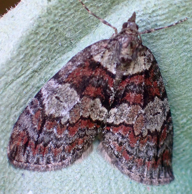 65. Red carpet /Fiolett båndmåler (Xanthorhoe decoloraria); 30th July. Overwinters as a small larva. Larval food plants: Lady’s mantle (Alchemilla spp.) (in the garden). NEW SPECIES FOR MALVIK MUNICIPALITY*