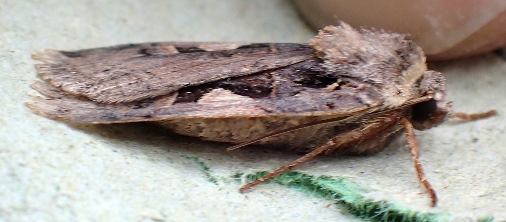 80. Dotted clay / Kantplettbakkefly (Xestia baja); 31st July to 12th August. Overwinters as a small larva. Larval food plants: Herbaceous plants such as stinging nettle (Urtica dioica) and, in spring, woody plants such as willows (Salix), birches (Betula), blackthorn (Prunus spinosa) and bog myrtle (Myrica gale) (all in the garden). THIRD RECORD FOR MALVIK MUNICIPALITY*