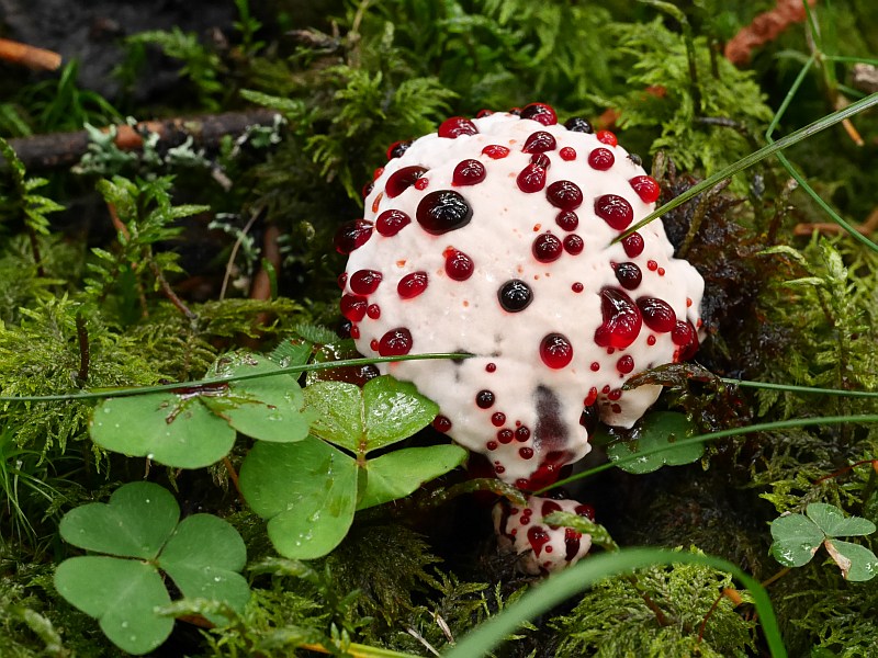 Called strawberries and cream, the bleeding tooth fungus, the red-juice tooth, or Devil’s tooth, Hydnellum peckii (Norwegian: skarp rustbrunpigg) is a widespread species in North America, Europe and Asia. It is related to the hedgehog fungus. Sadly, it doesn’t taste much like strawberries and cream, tasting very sharp…