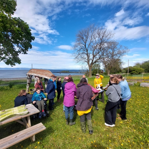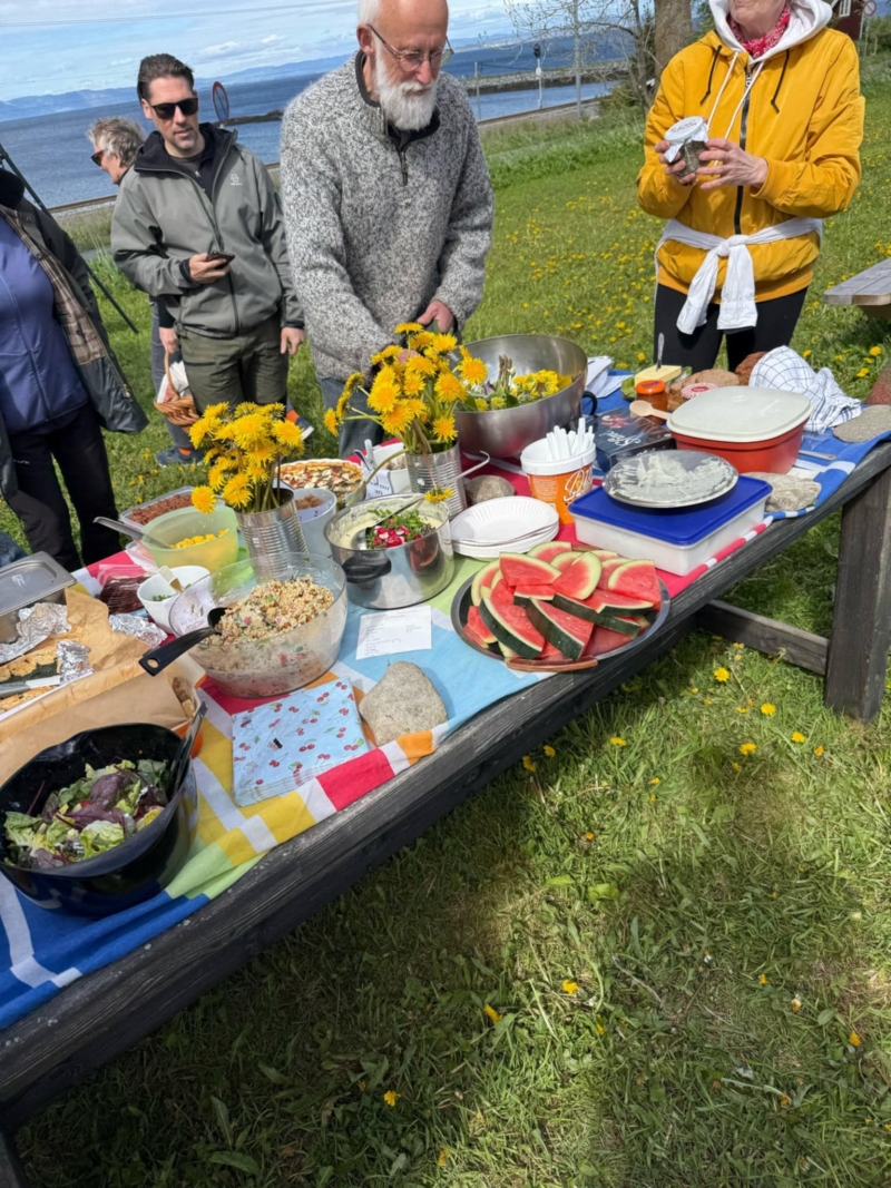 On Sunday 25th May 2025 we celebrated spring at the Væres Venners Community garden in Trondheim with a pot-luck party (kurvfest) and although the wind was strong there was no rain, unlike the days on either side. My contribution as usual was a diversity salad, this time based only on ingredients harvested in the World Garden (Verdenshagen) with roseroot (rosenrot) flowers in the centre and decorated with plants organised geographically as in the garden itself! The list of 89 plants used can be found here. As usual there were a diversity of dishes provided by other members, many with home grown or foraged ingredients. The party started with a talk by my friend Jurgen Wegter of Fagerli Naturgård in Vanvikan (on the other side of the fjord and just visible from Være) on biodiversity and what we can do to help in particular wild bees. Jurgen wrote a report for us Tiltaksplan for biologisk mangfold giving us advice as to what we can do to help and increase the biodiversity of the community garden.