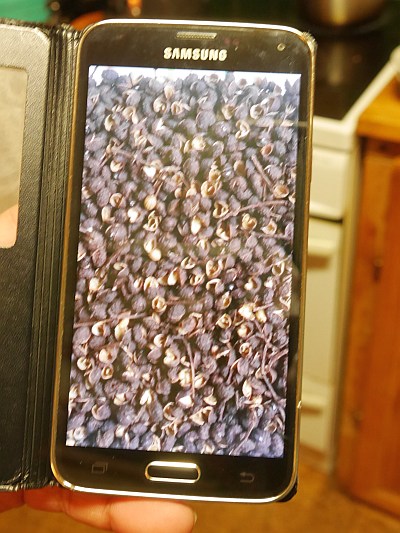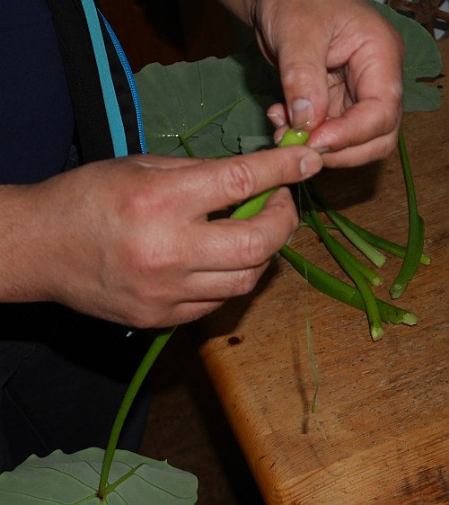 Another plant my new friends recognised was taro (karkalo) or Colocasia esculenta. I’ve grown this as a pot plant for several years for a couple of tubers a year, inside in winter and outside for most of the summer. Even in our cold climate it grows outside in summer! However, I’d never used the leaves as I thought one had to use special low-oxalate varieties (oxalate in the leaves can scratch your throat). They assured me I could eat it!