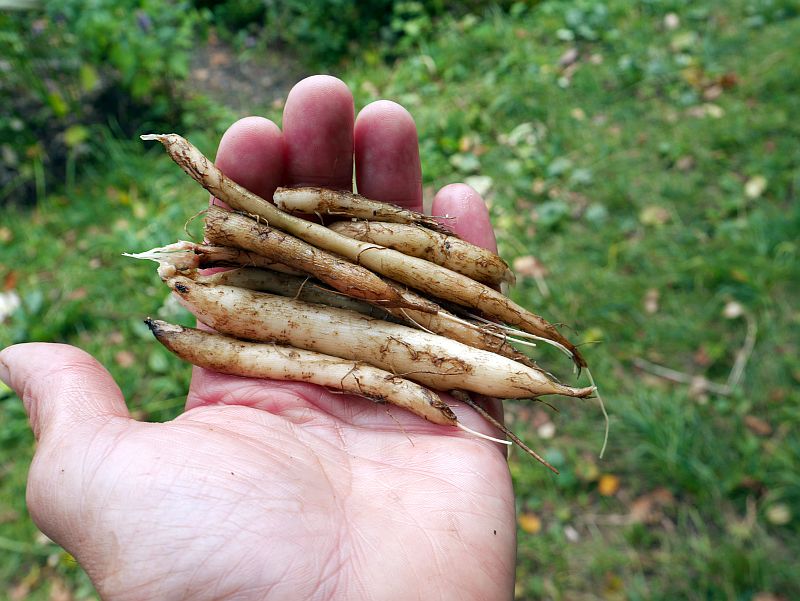 Two years ago I accidentally dug up one of my Queen Anne’s Thistles (Cirsium canum) and I discovered the tubers were quite like the tuberous thistle (Cirsium tuberosum). I’ve now dug them all up, harvested the largest roots and replanted. This really is a great plant: a thornless thistle which yields good size tubers that is also attractive to look at, is popular with pollinators and provides winter food for some bird species (oil rich seeds).